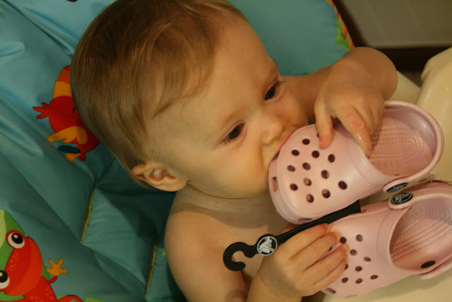When we got home in the huge stack of mail was a box for Hannah from her Poppy (Joe’s dad). Her first pair of Crocs. Poppy wears them all the time. They don’t fit quite yet, but they do make a great teether!