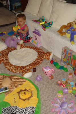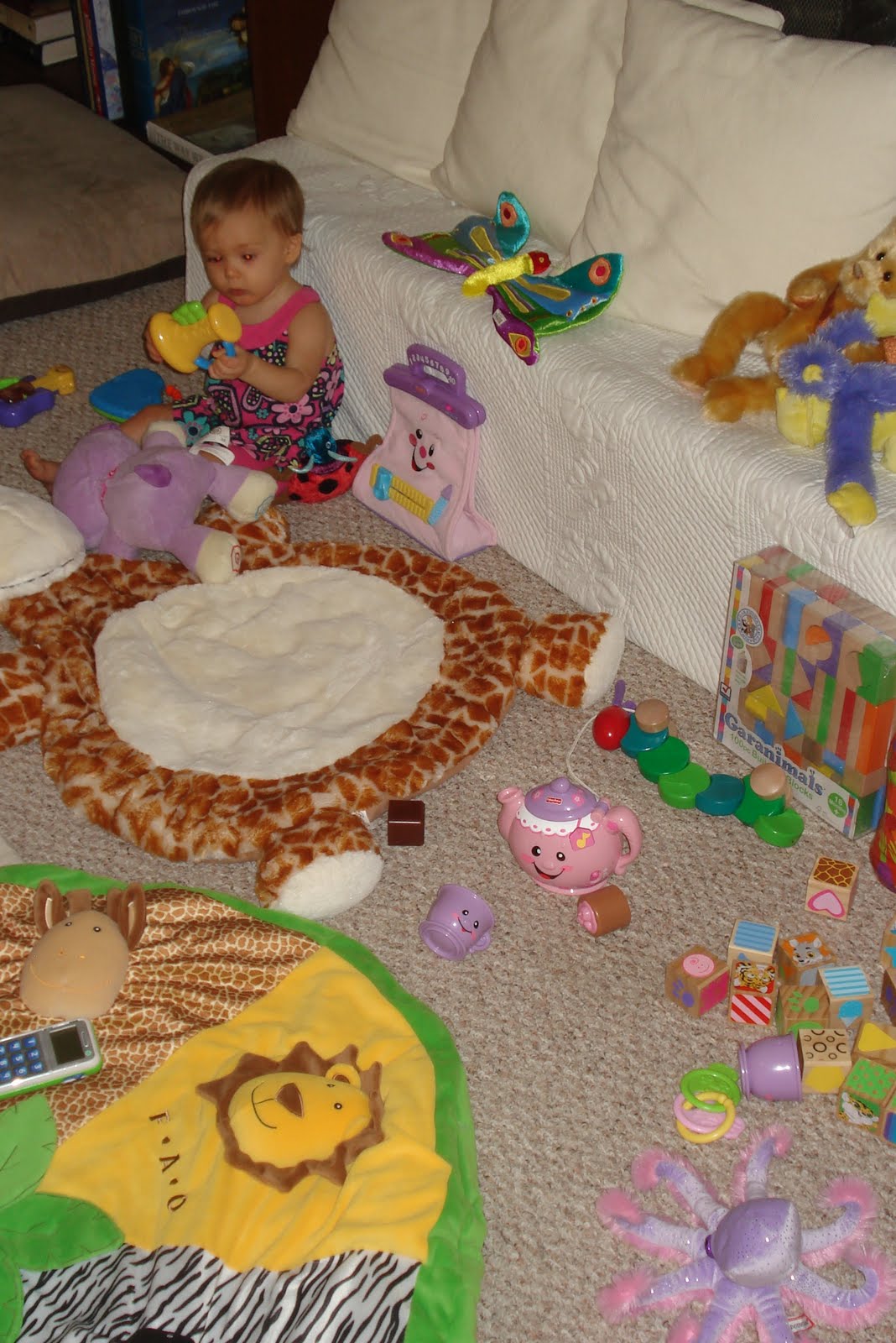 She has so many things to play with, plus the new toys she got for her birthday. There’s a whole area in the living room designated for her new toys – blocks, a tea set, a drum and other music noise-makers, a purse filled with all sorts of things, a play mat that makes animal sounds, sweet plush animals – including a ladybug and octopus and pull-along caterpillars. She’ll play for a minute or two, and then she roams around finding something to do that will annoy me. And I’m quite sure she knows it. Just as her hand reaches up to pull the plug out of the wall, she’ll turn around and look at me sometimes even before I say her name. Guilty as charged.