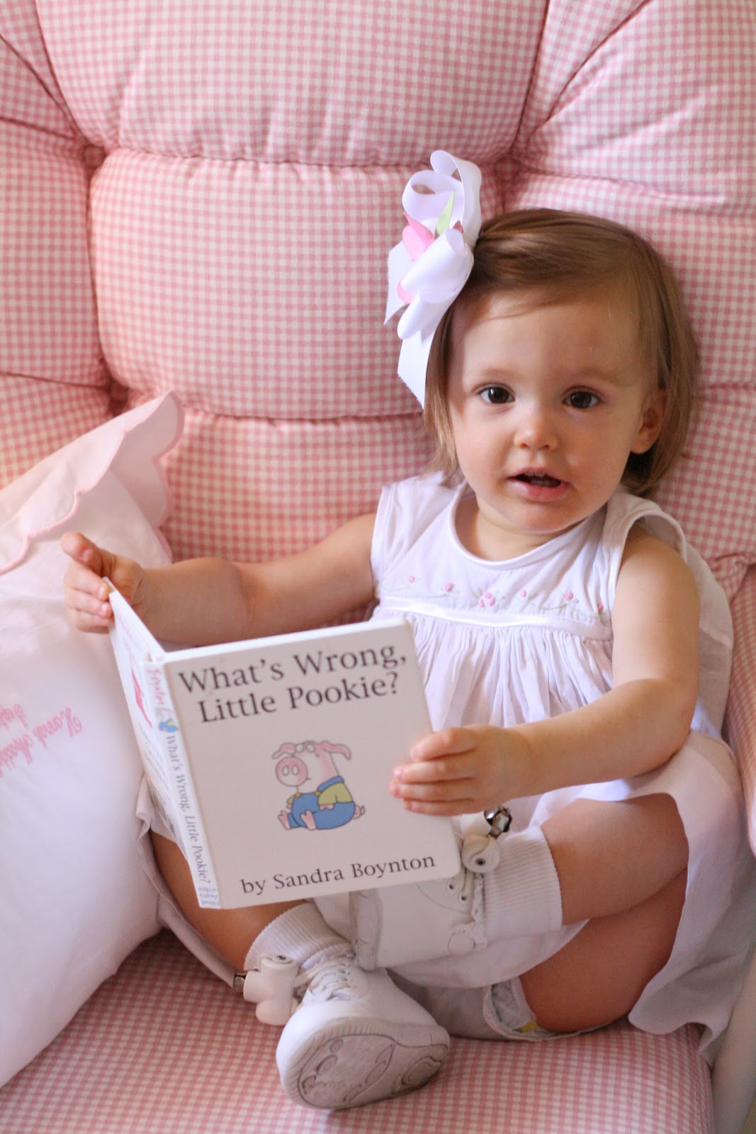 names – her own, Poppy (Joe III), Uncle Ben and Uncle Will Will, Aunt Kate (Katie), Chlo-Co (Chloe), Mollie, Uncle John (her godfather), Margi (Ms. Margaret who watches her at the church nursery), Elmo (from her diapers and books – she doesn’t watch tv), Pookie (from the Little Pookie books), and Spensey Boo (Spenser, Mom’s dog, her favorite word probably)