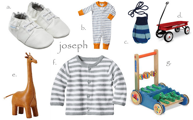 a. White shoes. These from Robeez are super cute. b. Hanna Andersson sleeper. c. mittens attached by a string. d. Radio Flyer wagon. {I like the idea of the classic metal wagon, but Joe has talked me into something more practical and safe since it will most likely be big sister pulling it. It’s been purchased.} e. I am nuts about the Menagerie bookends at Serena and Lily. f. Sweater…a necessity. I prefer the gray but the blue is nice too. g. Push toy. This one is Melissa & Doug.