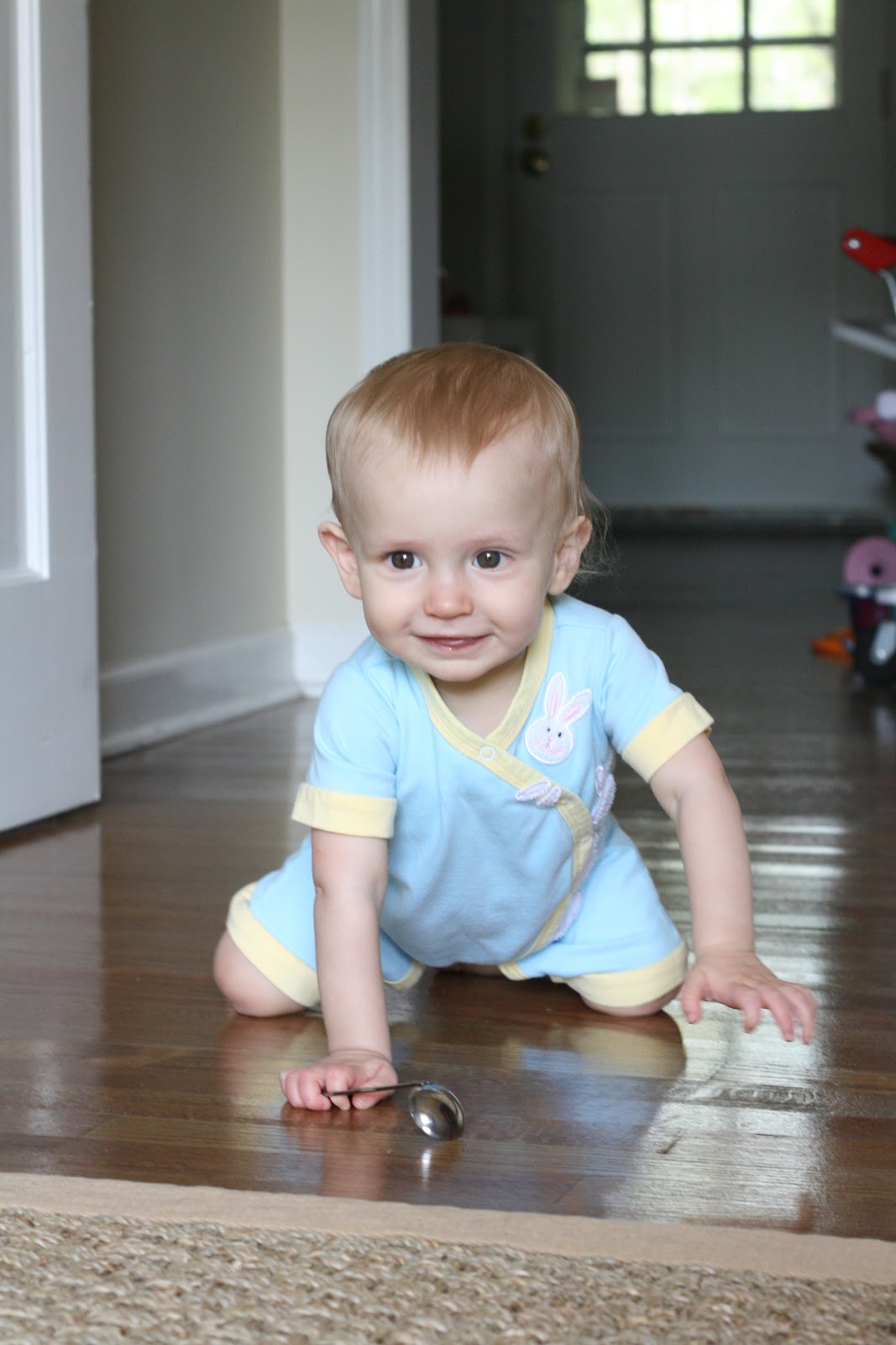 He is crawling – so fast and all over the place. He’s pulling up and standing at Hannah’s kitchen and the little piano, at the coffee table, and pretty much anywhere else. He’s cruising around and he’ll take steps while we hold his hands. He can entertain himself for a long time in the playroom – with or without Hannah.