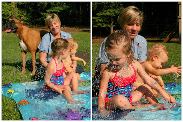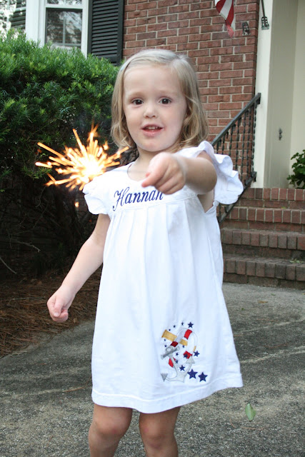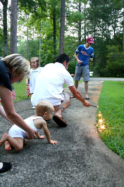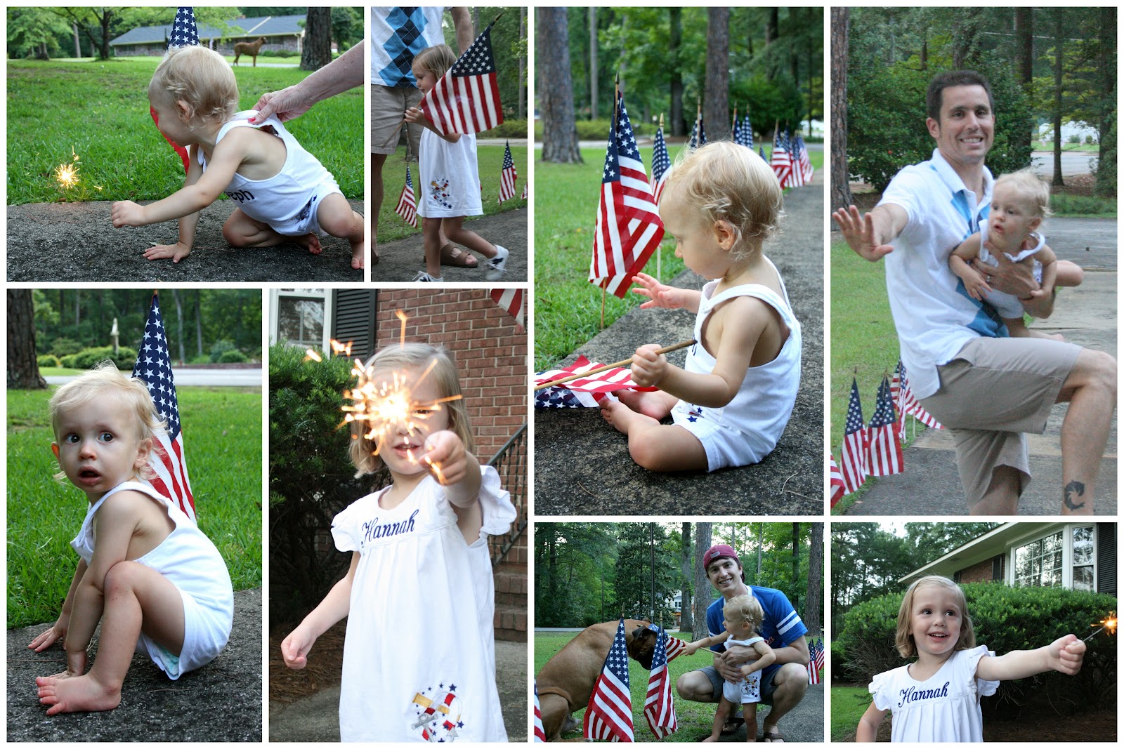 My mind is so confused as to what day it is right now. With Joe having Wednesday off, but not yesterday, and then having his usual day off today, it’s hard to believe that tomorrow is only Saturday… {I should add that Joe has still been working here at home on his dissertation, but he did take Wednesday off to play.} My mom and Will came to town to sweat with us. We ate lunch at Dairy Lane, a Sandersville staple. While there, Joseph got sick and created quite a mess. He and I ended up at the nursery next door, sitting on a swing by a koi pond. But, Hannah got her ice cream cone with sprinkles and enjoyed it thoroughly. After naps we played outside and later, lit sparklers. Joseph did not understand why he couldn’t touch them. Joe cooked a yummy dinner of turkey, squash casserole, tomato pie, and grilled corn on the cob (all vegetables Hannah and I bought at the farmer’s market). We had a good time celebrating America’s birthday, despite the oppressive heat.