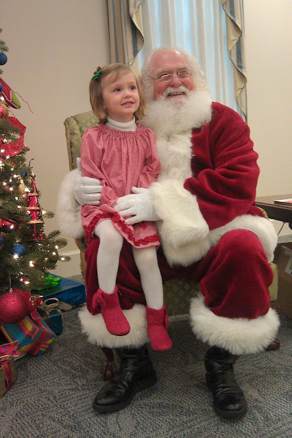 Thursday I took the kids to see Santa at the bank here in town. Just as I was pulling into the parking lot, Joseph threw up. All over himself and the carseat. Joe drove over from the church to help me clean everything up, and I took Hannah in to see Santa for a minute. Why should she miss out?