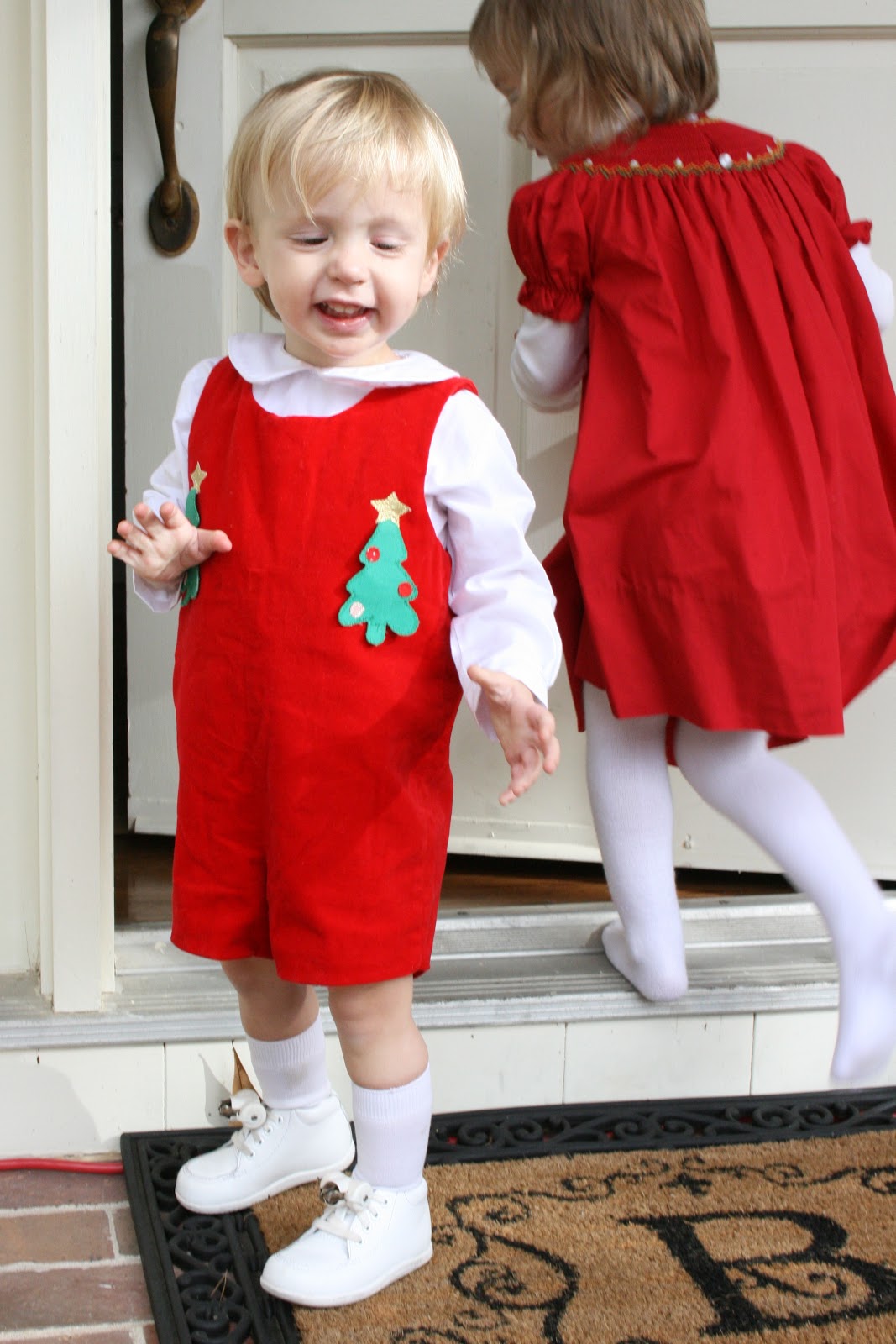 After church yesterday (and after Joseph threw up at lunch) we came back home. He was completely fine, so I let he and Hannah play at the front door. Joseph’s is wearing one of three matching outfits that my brother and two cousins wore Christmas 1980. I wanted to be sure to get a picture of him in it.