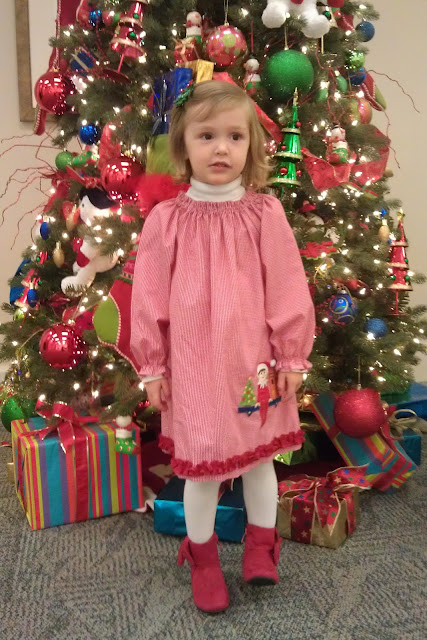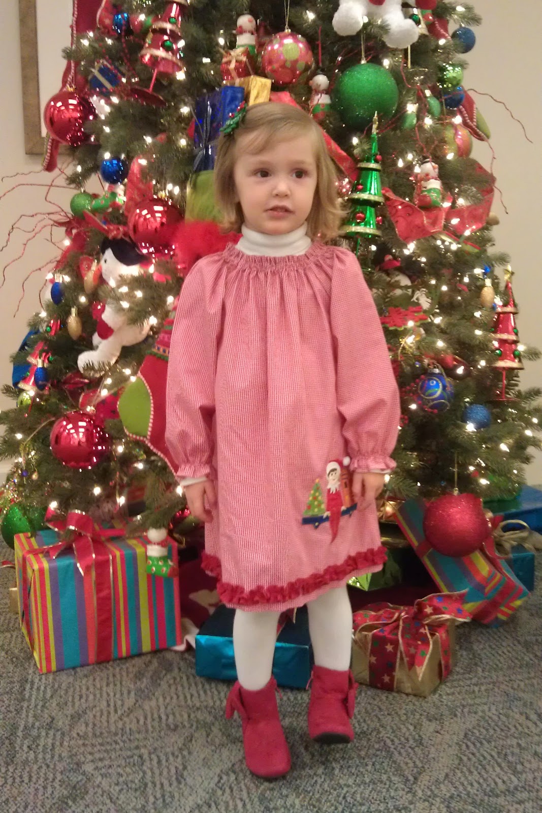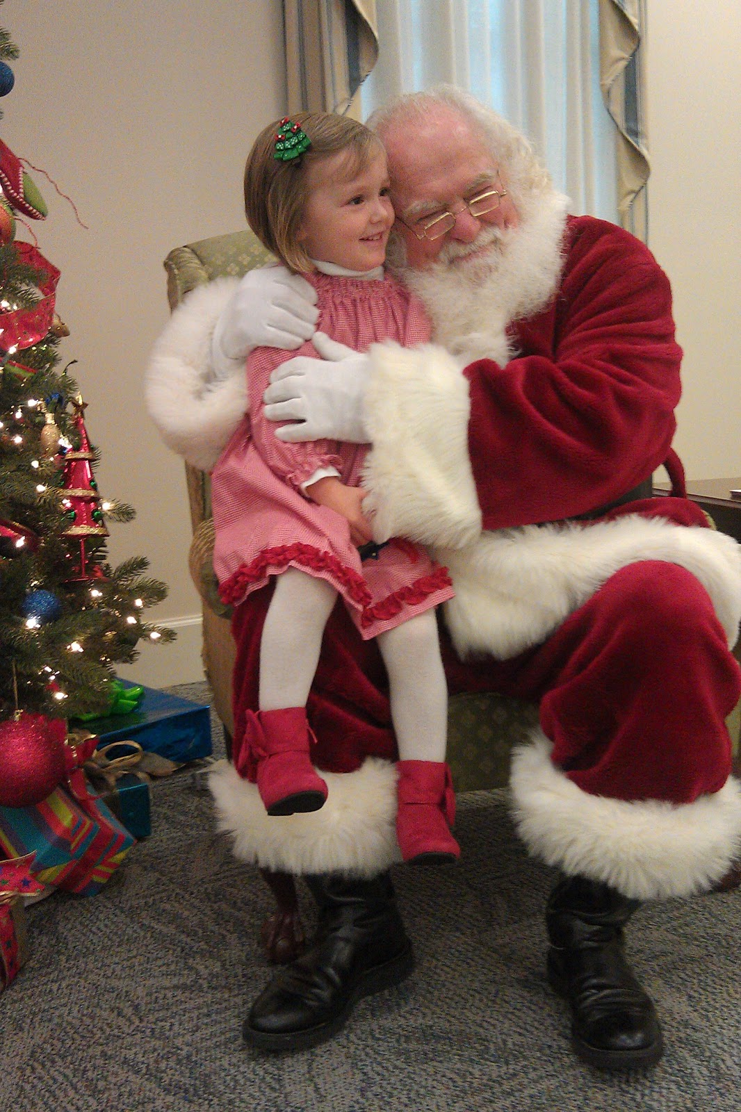 Hannah, wearing her Elf-on-the-Shelf dress, was quite surprised when Santa said he knew her elf and that Bernard was telling Santa about Hannah!
