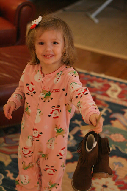Hannah got fringed suede boots and a step stool for the bathroom, and Joseph got a giraffe neck pillow for the car, a GT hat and gloves, and a dustpan and brush (possible the most exciting present for him). Both got new pajamas and books, among other things. We were careful to not go overboard this year, and everyone was thrilled.