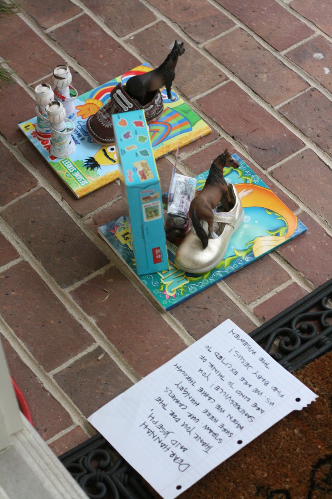{The note says: Dear Hannah and Joseph, Thank you for the straw. Our camels sure were hungry when we came through Sandersville! You are kind to think of us. We are excited to find Baby Jesus! – The Wise Men}