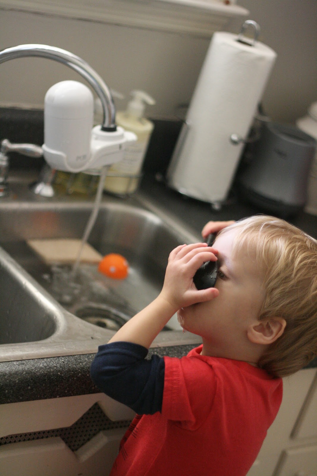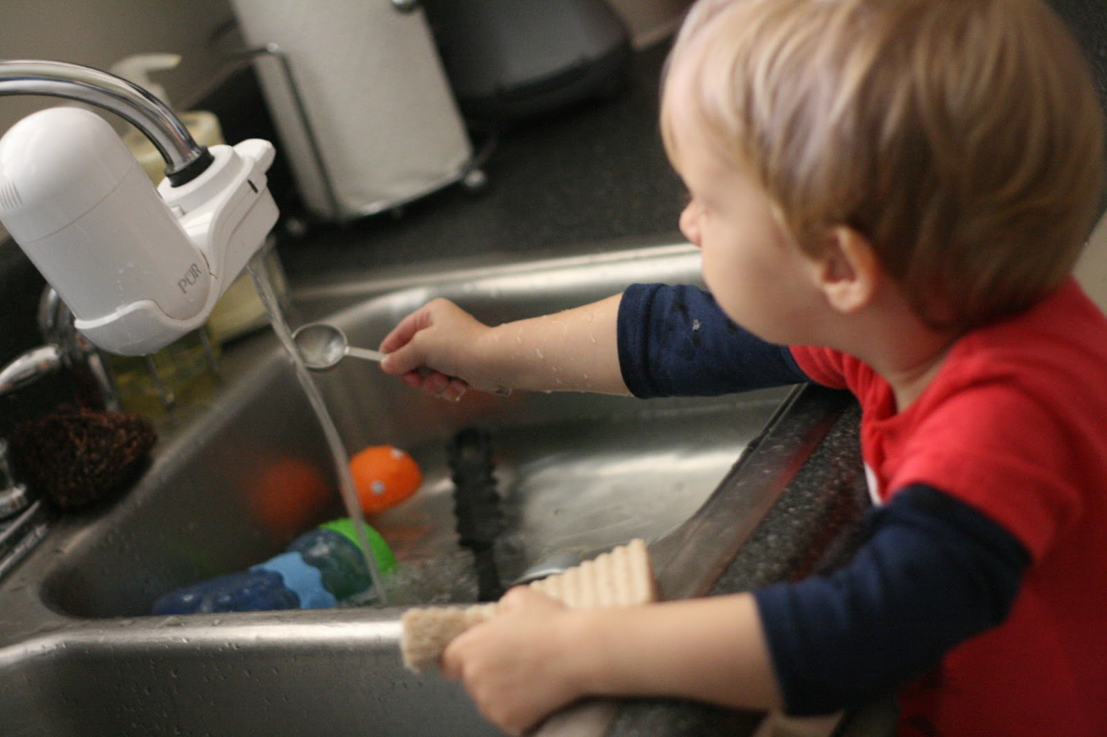 Joseph likes to be in the kitchen whenever we are. This past weekend he discovered, and I finally thought of, the kitchen sink. Delightful means of entertainment.