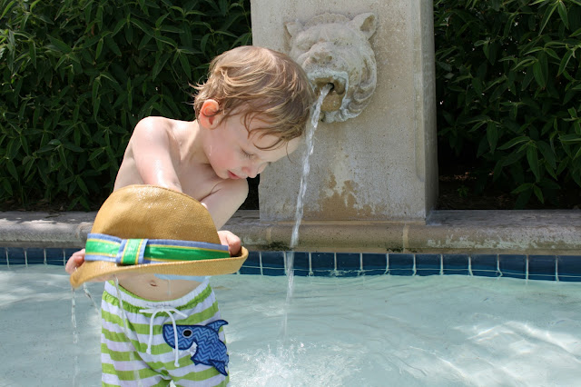 Joseph especially liked the fountains on the side of the pool. He quickly realized his hat would make a great bucket, so he filled it up, dumped it, and filled it up again…