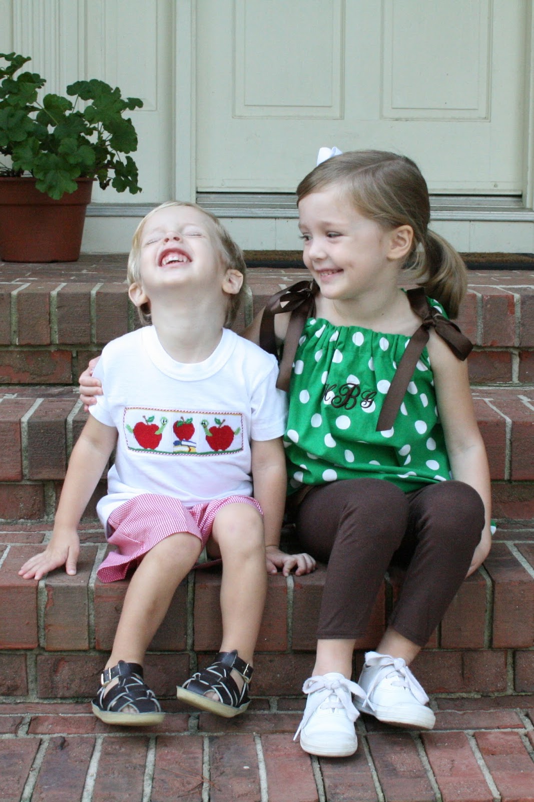 My mom gave them these outfits, and I intended for Hannah to wear her matching red gingham dress with apples smocked along the top but the dress was too long for the playground. She got to wear it Sunday and if I get a chance, I’ll add a picture of her wearing it again. The little (opinionated) fashionista and I settled on this short pillowcase dress and leggings instead.