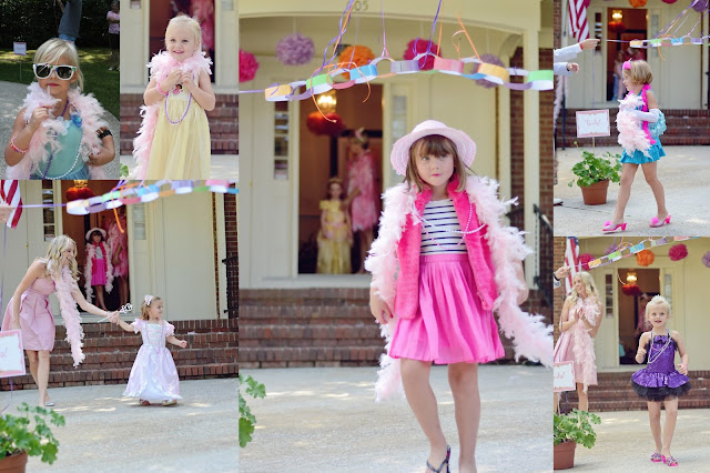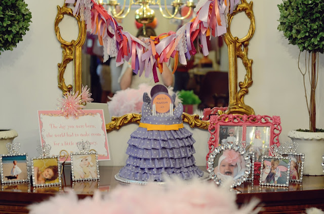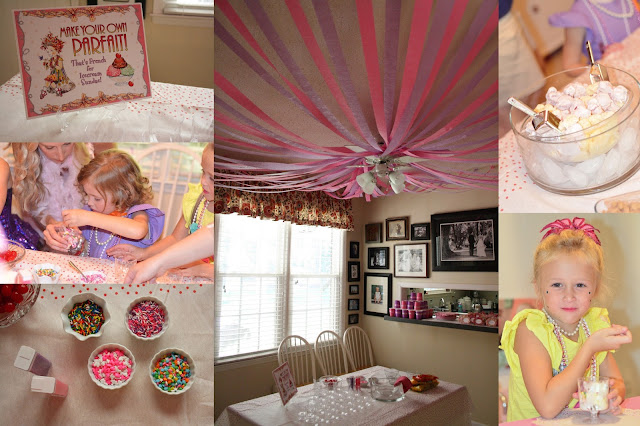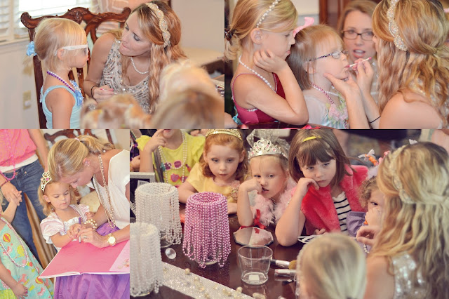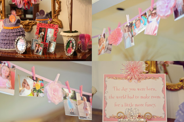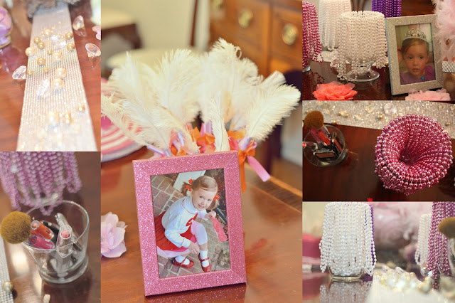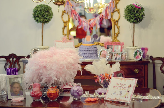 I hung a garland of pictures of Hannah being fancy, framed others, and filled glass vases with beads. The dining room was for accessorizing. I made plume pens, a la Nancy, for favors.