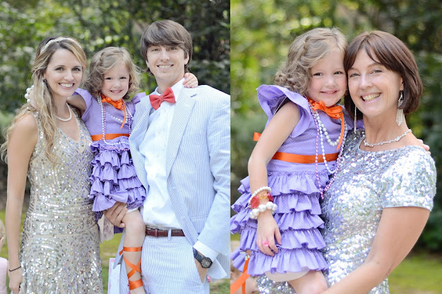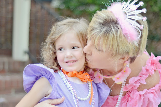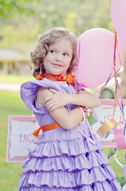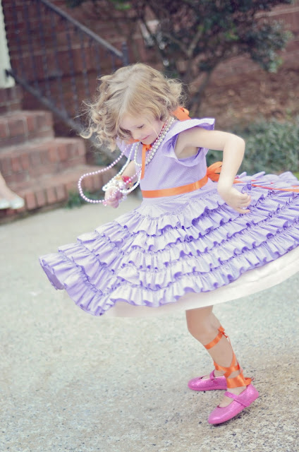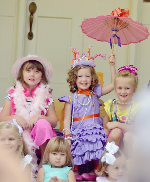 Hannah wore a dress made just for her by a sweet friend, Mrs. Tammie: purple with tiny white dots, ruffles, and an orange sash just like Nancy’s…and just like the cake. I wrapped her legs in orange ribbon, gave her a pair of orange fairy wings and a pink parasol, and made a dollar-store tiara as tacky as possible. Fancy Hannah.