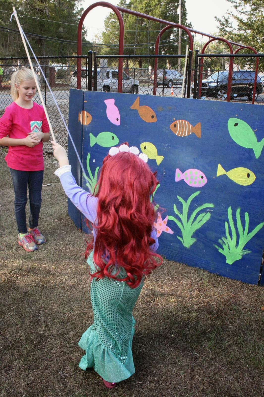 After dinner was the trunk-or-treat, where as you probably know (or can figure out) is when all the kids go car to car trick-or-treating from trunks. We’ve participated the last three years. This year we stuck to the mermaid/shark theme and made our trunk look like the sea. Obviously, Joe and I had to take part with poster board goldfish costumes.