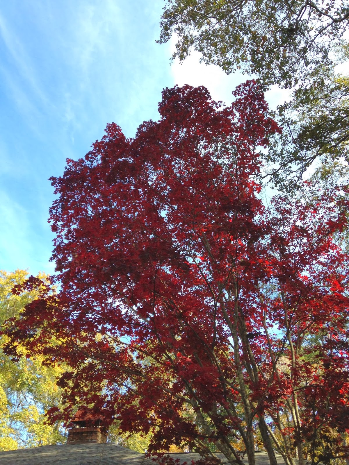 This is a tree in our frontyard, right outside the office window. The leaves are a cranberry red – beautiful. Unfortunately, it didn’t stay that way for long. I took this picture with my phone and four days later, as Joe was wrapping Christmas lights around that very tree, this was the scene: