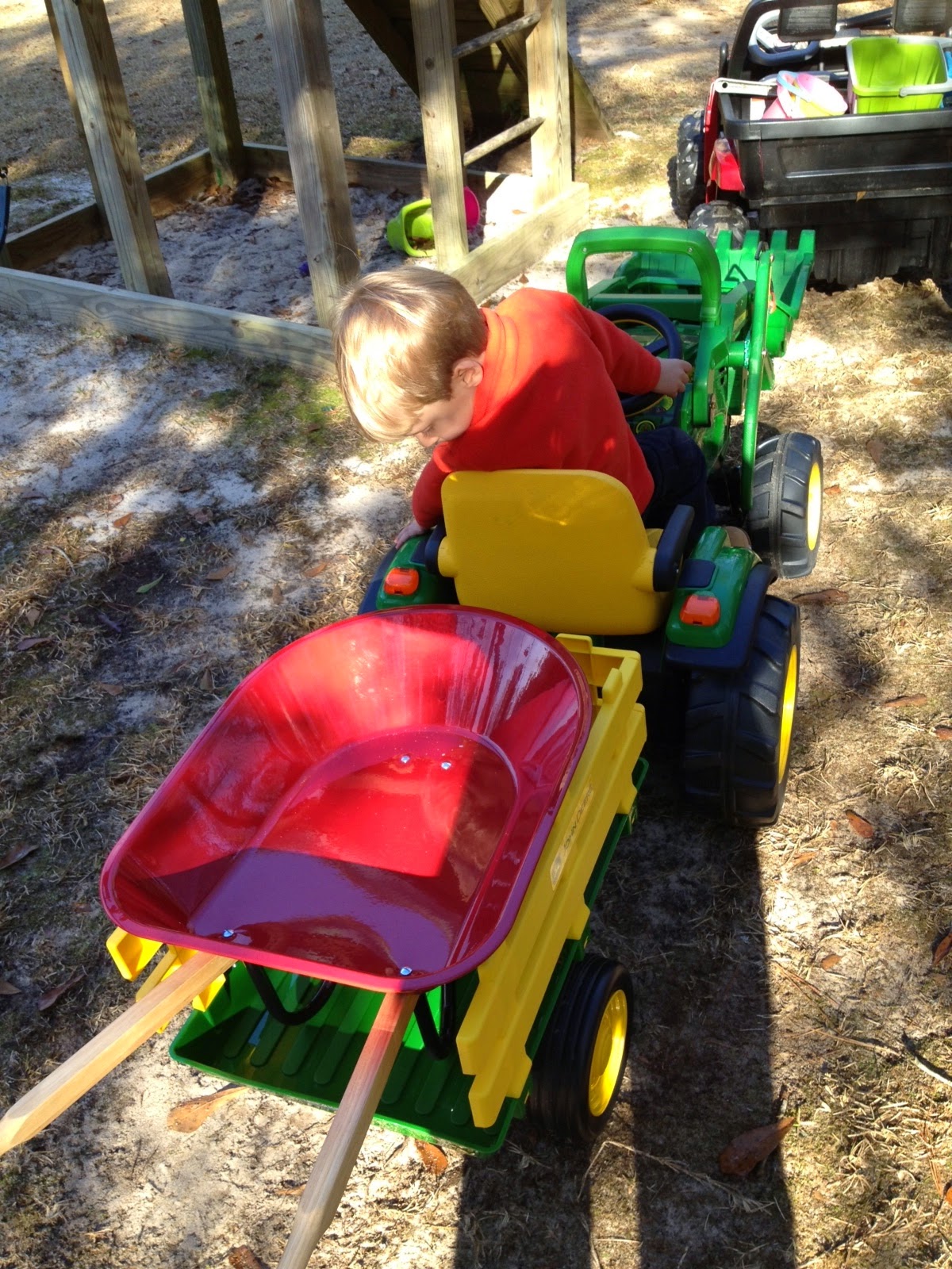 We headed outside where Joe and I modeled my new scarf and his new sweater (thanks Sarah and Betsy!), and Joseph loaded up his new wheel barrow in his trailer.