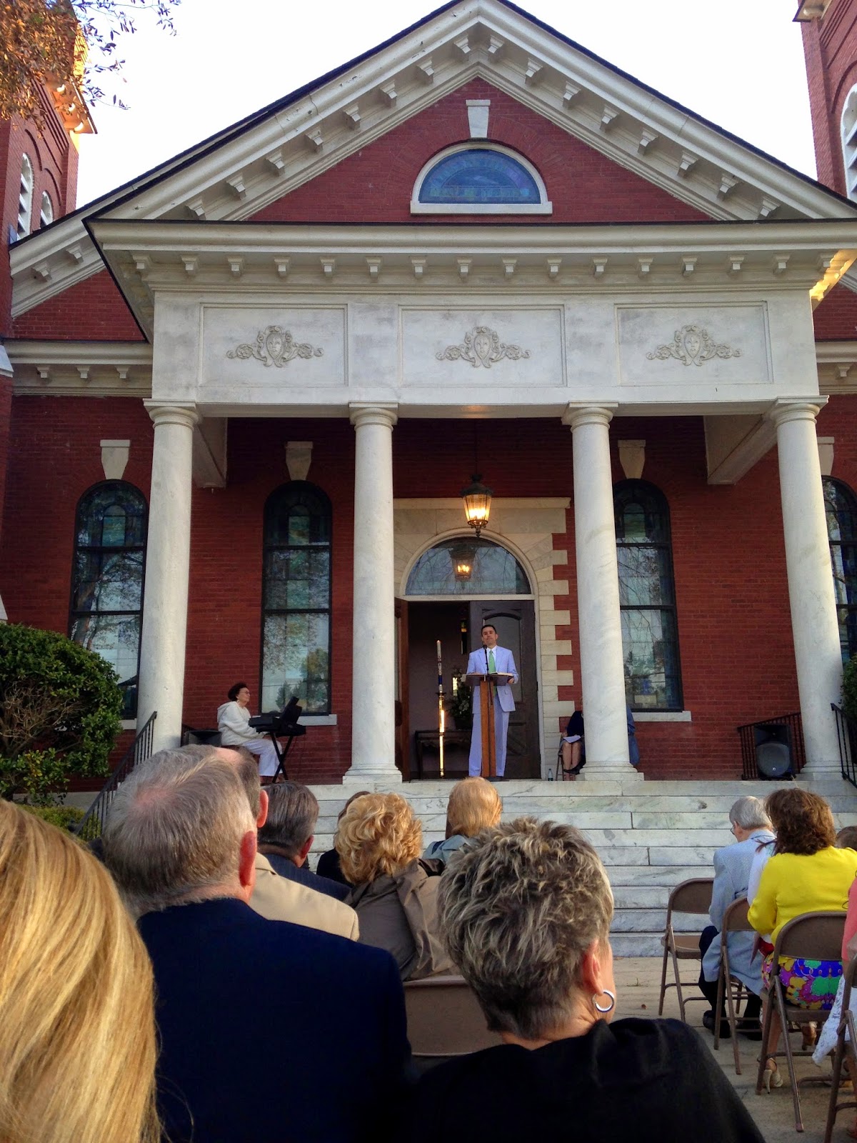 I wised up from last year (another windy and cold morning) and dressed accordingly. Top and suit jacket but with skinny jeans instead of the suit skirt. Hannah wore her pink metallic skinny jeans and bunny shirt – with a turtleneck underneath and a coat on top! I did run to the car and grab our warm PBK fleece blanket. My sweet girl crawled into my lap and munched on dry cereal during Daddy’s sermon.
