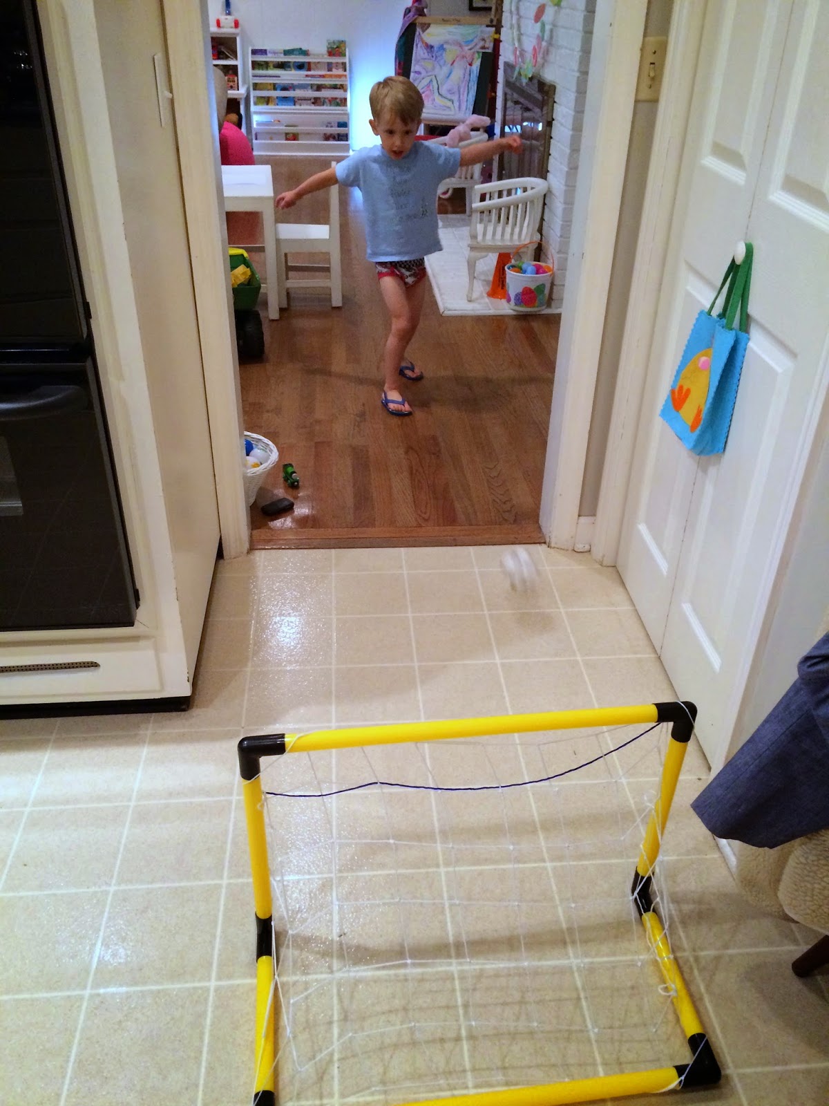 Meme gave “Daddy” a mini soccer goal. Joseph was eager to try it out while pizza was in the oven for dinner…