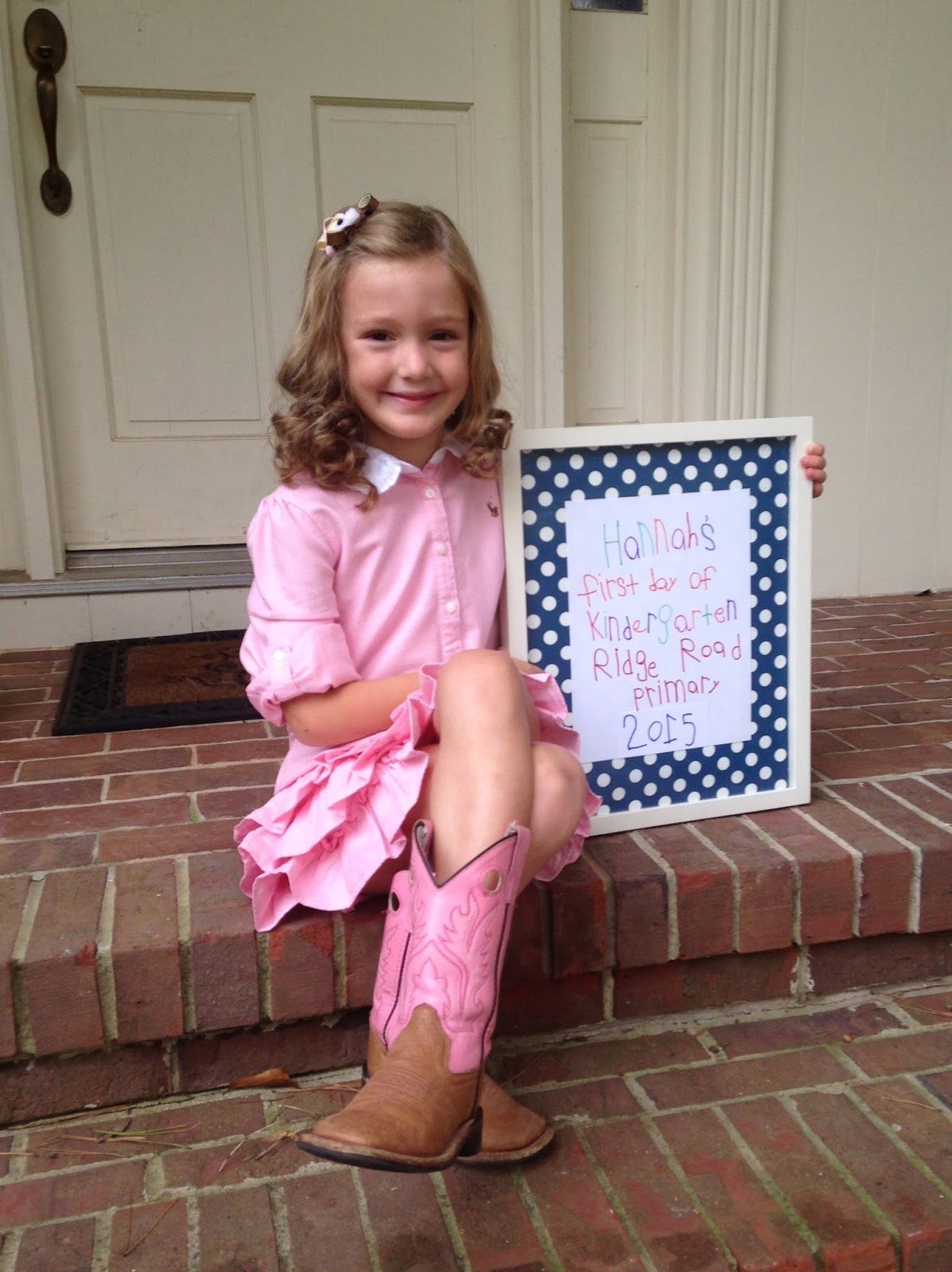 Goodness gracious, how cute is my baby girl?! Those curls! Hannah asked me if she could have curly hair on the first day of school. As long as she was fine with sleeping in sponge rollers than I couldn’t say no to that request. I chose the pink dress, to which she (of course) agreed. She chose the boots.