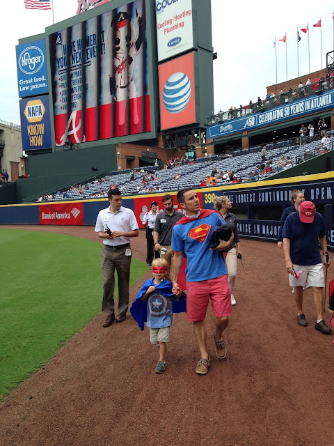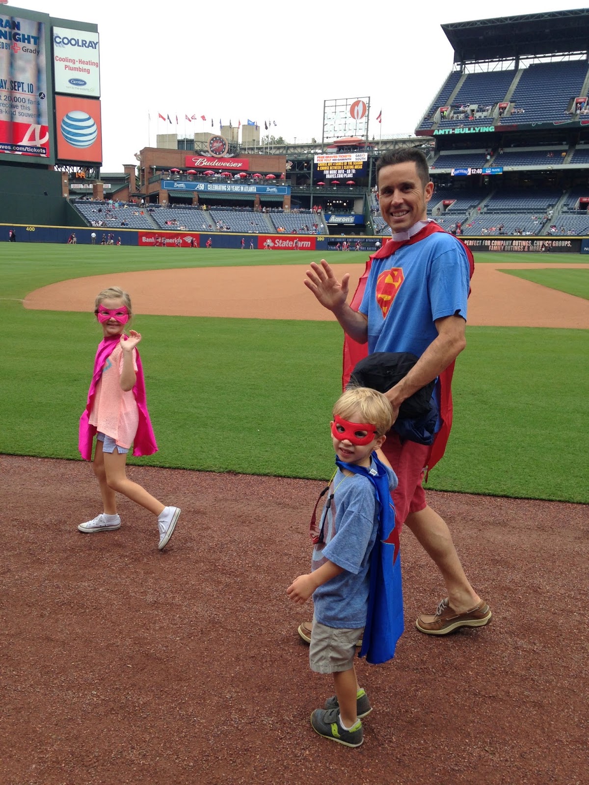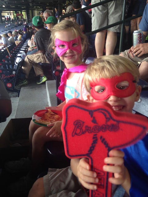 Joe and I also surprised the kids with special tickets to their first Braves game! It was the inaugural Superhero Day. We picked out shirts to give them before we left town and I ordered masks online. We were each given superhero capes, but Hannah and Joseph had their own – thanks to a Christmas present from Aunt Katie and Uncle Ben.