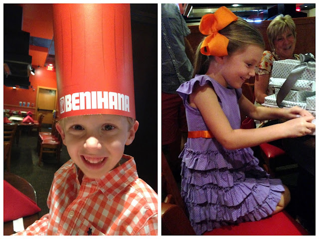 We got to the restaurant, Benihana, and Hannah changed into her selected outfit. The custom-made Fancy Nancy Dress from her 4th birthday. It was a little short, but I didn’t want to say no. She loves how it twirls…