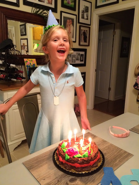 Perhaps the cutest part of the whole day was her excitement in getting the grocery-store cake she requested. A month prior when we were out for a walk, talking about her birthday, she told me she wanted a Harvey’s cake. Specifically she wanted, “a yellow cake with chocolate icing, with a pink ribbon around it with a bow, and pink and blue kinda sunflowers”. Well, there are no blue flowers, and they aren’t exactly sunflowers, but the cake lady was off that week and I had to get another employee to tweak the one off the shelf for me. I guess it was just fine; Hannah was ecstatic when she saw it that afternoon! {During the same conversation when I was trying to get her to tell me what all she might like for her birthday, her answers were “American Girl doll, Lego stuff, and an Elsa dress.”}