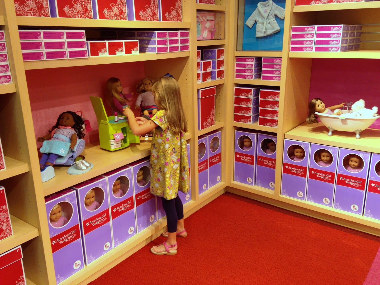 Dinner was fun and yummy. Both kids love restaurants where they “cook on the table” and tend to eat really good, too. Hannah opened some presents from Meme, including her pearl necklace with 6 new pearls added, and outfits for her doll (an Elsa and an Anna costume!!). She also opened a doll carrier from Uncle Will Will and Aunt Crystal and a gift card from Aunt Sarah and Aunt Betsy. She was over-the-moon and we hadn’t even gotten to the main purpose of our trip: the American Girl STORE.
