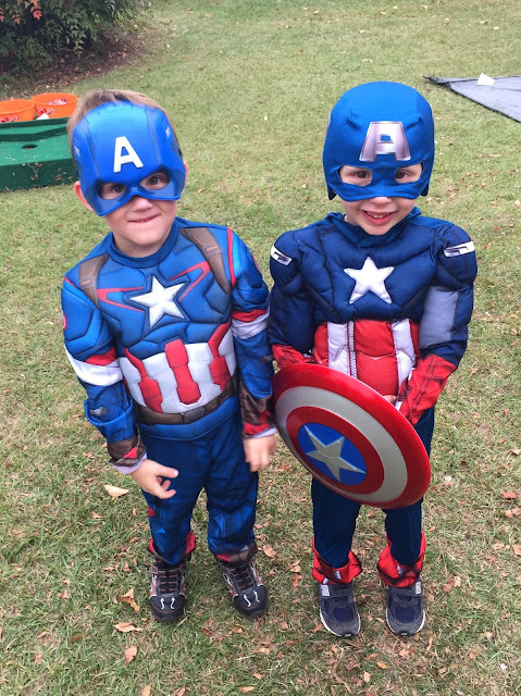 Their costumes were so much fun this year. Joseph was super pumped to be Captain America. Those little kid muscle costumes are hysterical. I had to buy the shield separately, but I mean, come on. How could I not?!