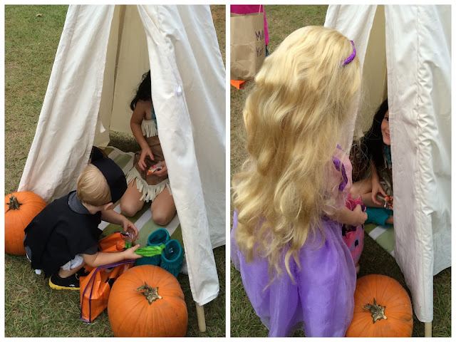 Enter the teepee from our playroom. Stick Pocahontas in there with her basket of corn (er, candy corn), and set some pumpkins outside.