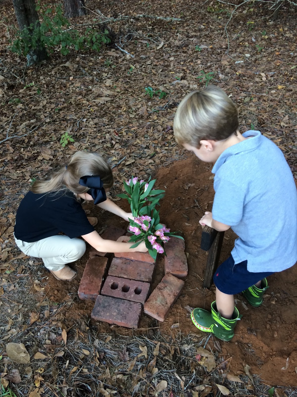 It was so sad. There were a lot of tears. The boys arranged bricks over the dirt and Hannah put flowers in the bricks’ holes. We said a prayer and later that night went out again to the tree line where she was buried and said goodnight.